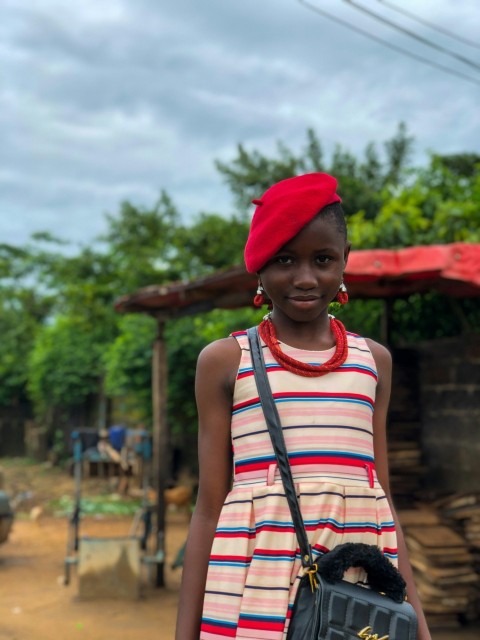 a person wearing a red hat and a striped shirt