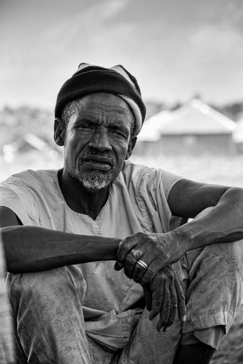man in black and white stripe dress shirt and black pants sitting on concrete bench