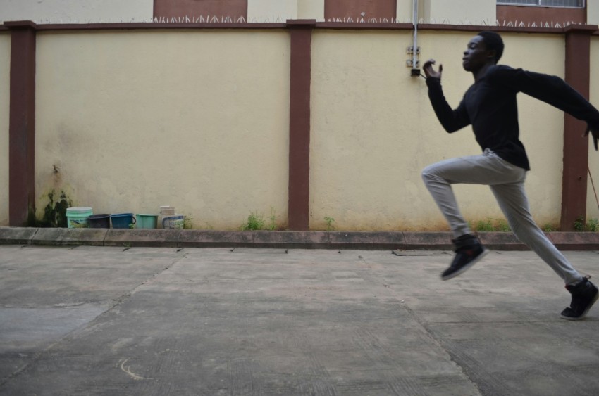 man in black and white stripe shirt and black pants standing in front of fish tank
