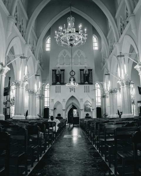 grayscale photography of man wearing shirt sitting on wooden bench inside building JqoVC6P