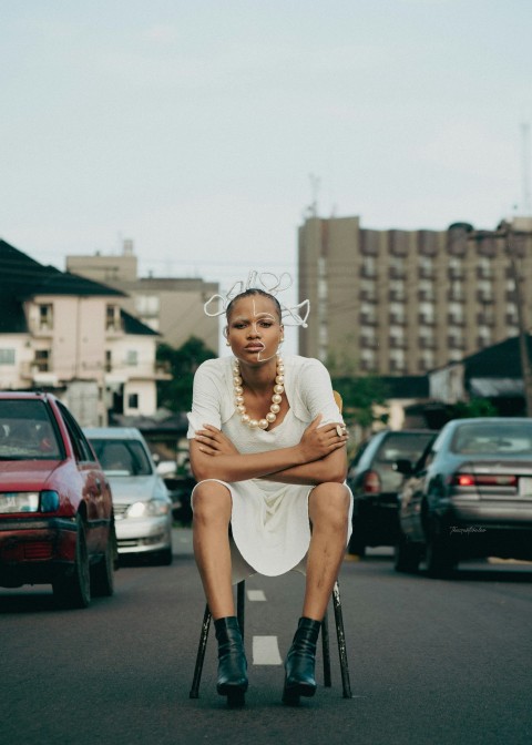 a man in a white dress sitting on a wheelchair in a parking lot