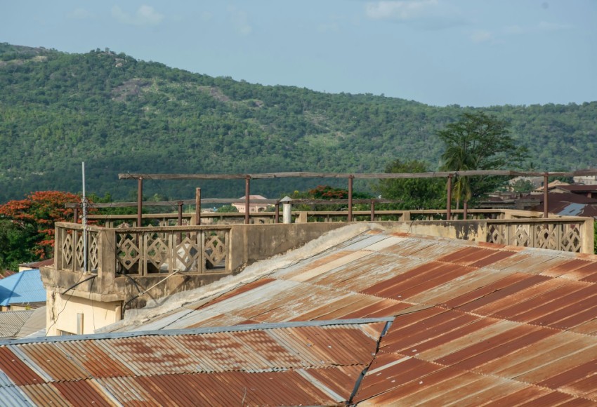 a wooden deck with a fence and trees in the background