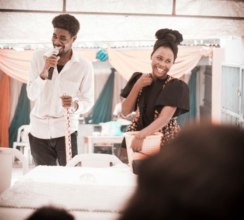 man in black polo shirt standing beside woman in black and white polka dot dress