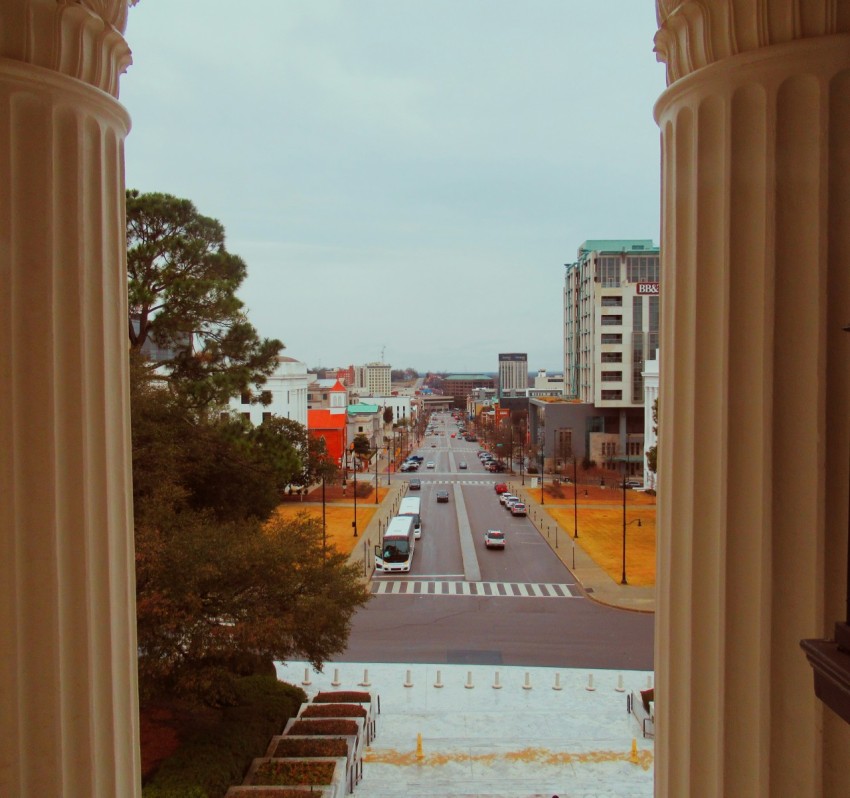 vehicles on street between buildings view from window