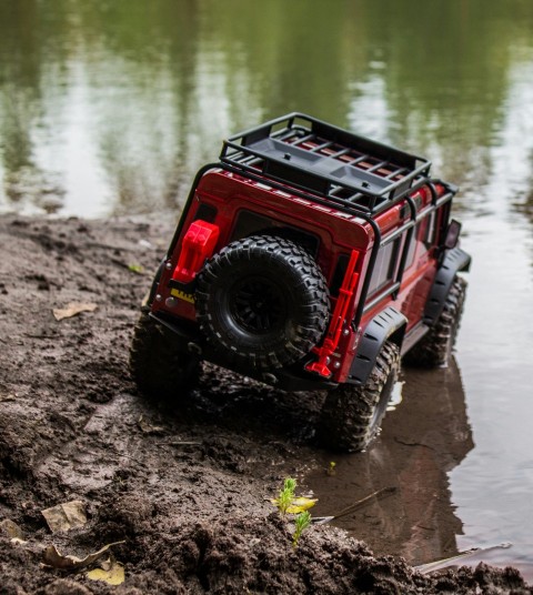 black and red suv on muddy road leading to body of water