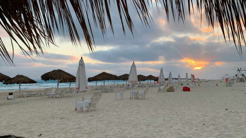 a sandy beach with umbrellas and chairs under a cloudy sky