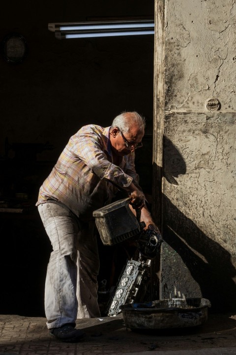 man in brown and gray plaid dress shirt and gray denim jeans holding black camera