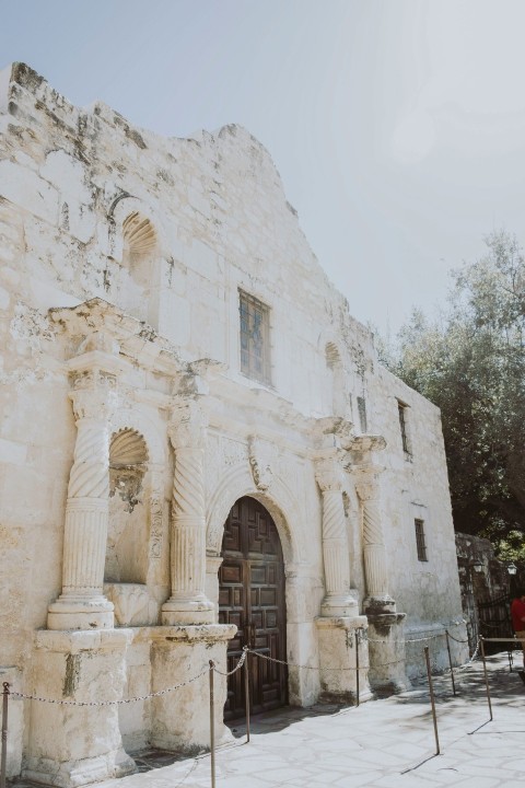 white and brown concrete cathedral beside green tree under white sky at daytime