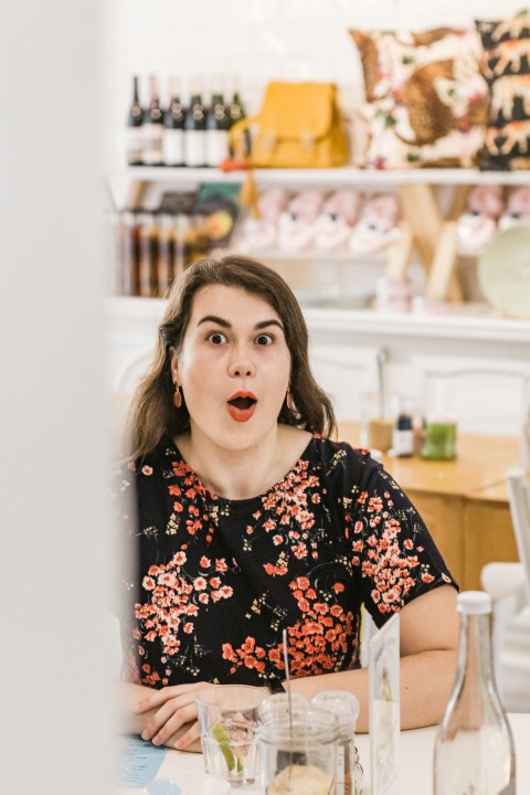 girl in black white and red floral shirt