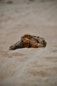 a rock sticking out of the sand on a beach 9XRCI Lyq