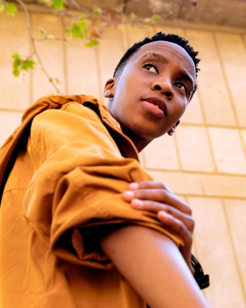 woman in white shirt pointing