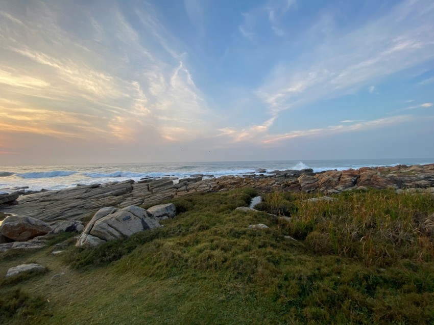 a grassy field next to a body of water