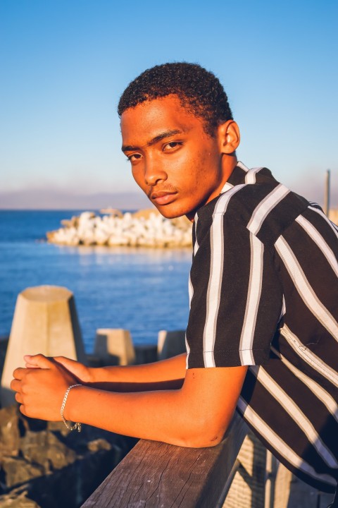 man in black and white striped polo shirt holding white ceramic mug