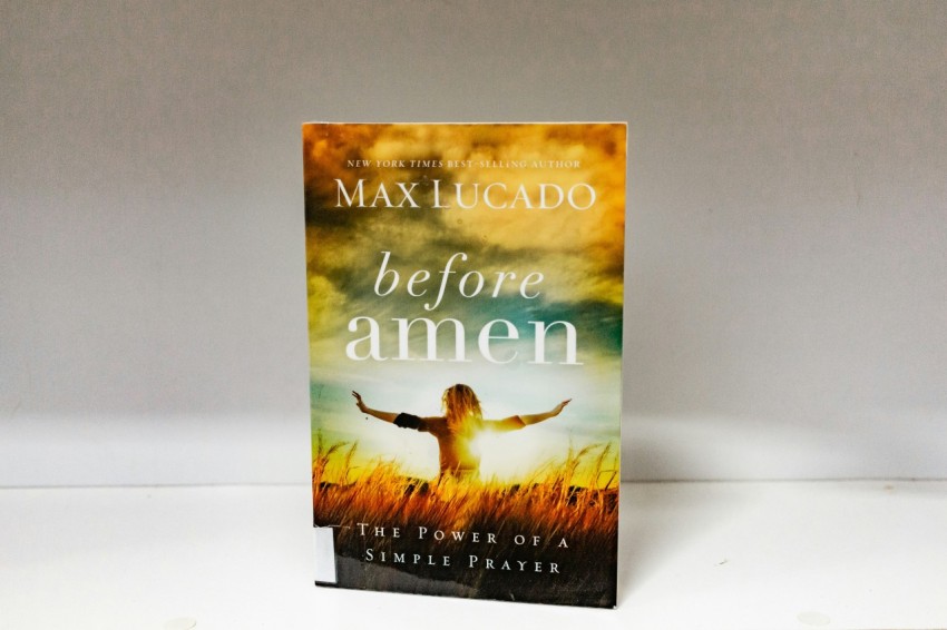 black framed eyeglasses on white book page beside brown ceramic mug on white textile