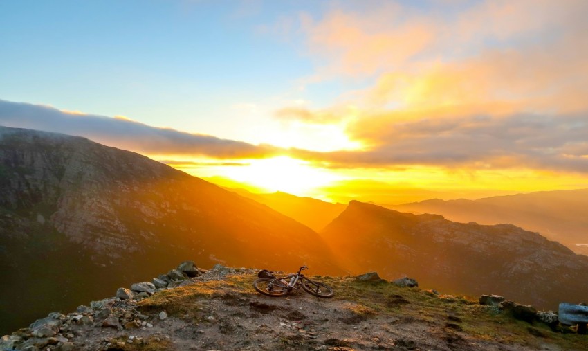 a bird is perched on the top of a mountain