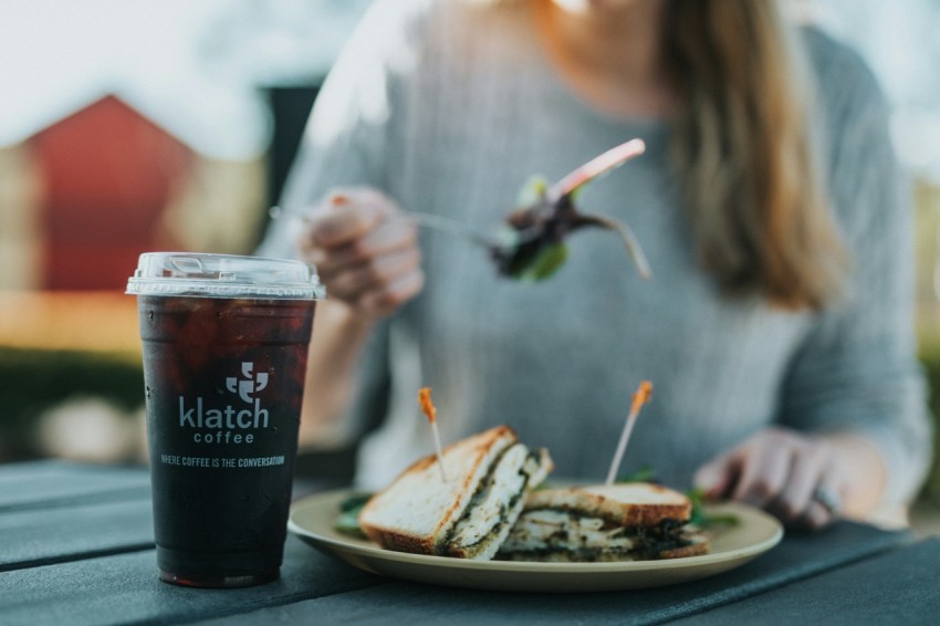 woman in white long sleeve shirt holding black and white ceramic round plate with food
