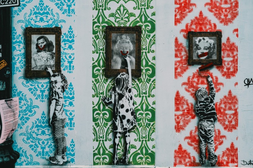 woman in black and white dress standing beside red white and blue wall