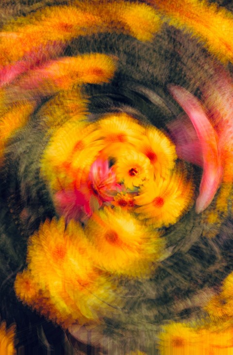 a field of yellow flowers next to a pond n5rxZ