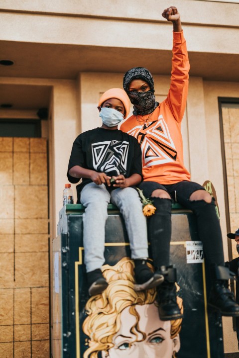 man in black and white nike hoodie sitting on blue plastic chair