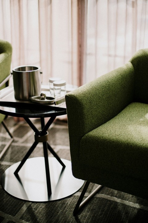 black metal table with white ceramic mug and saucer on top