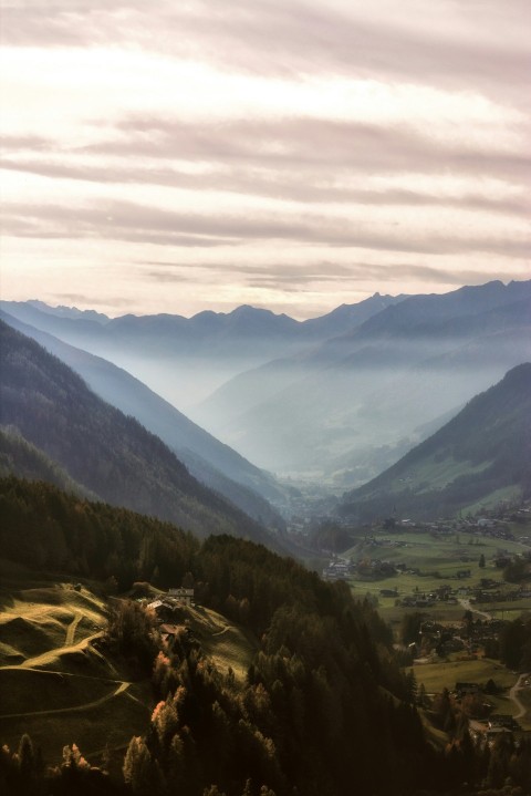 black mountains surrounded by trees under brown sky during daytime