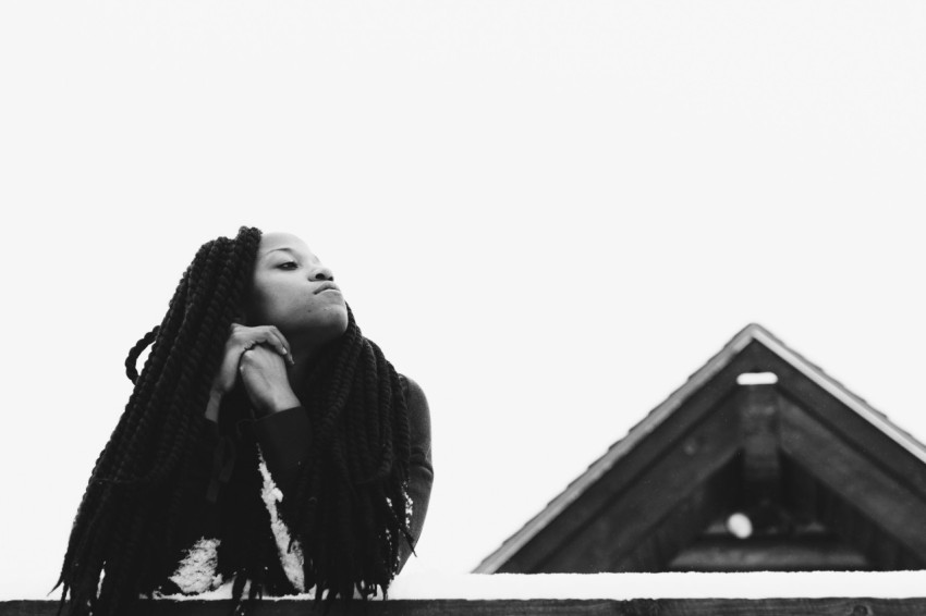 grayscale photography of woman leaning on wood