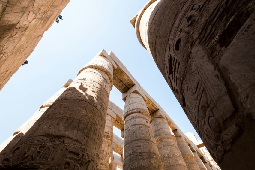 a woman standing on a bridge in an egyptian temple