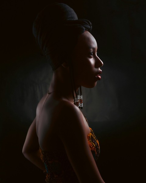 a woman wearing a head scarf and earrings
