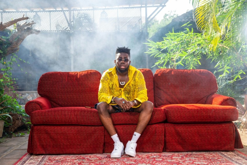 a man sitting on a red couch