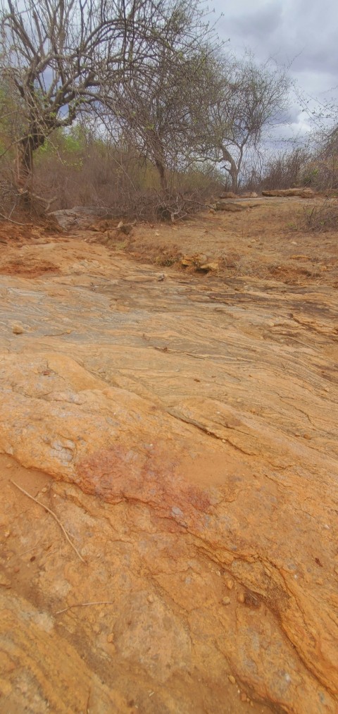 a dirt field with trees in the background