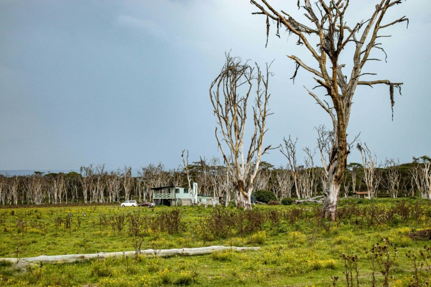 a field with trees and a house in the background