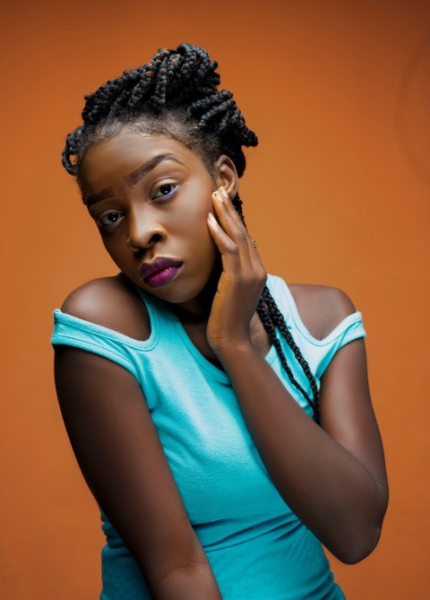 photo of woman wearing purple lipstick and black crew neck shirt