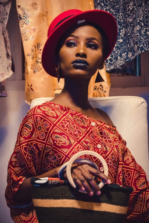 woman in red and white floral dress