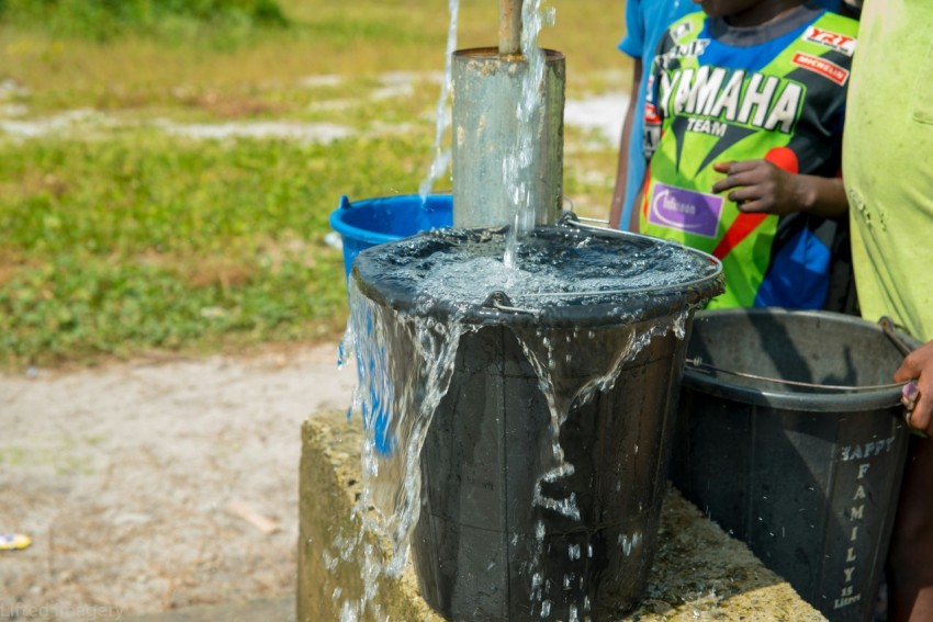 boy in red and white crew neck t shirt standing on blue plastic bucket