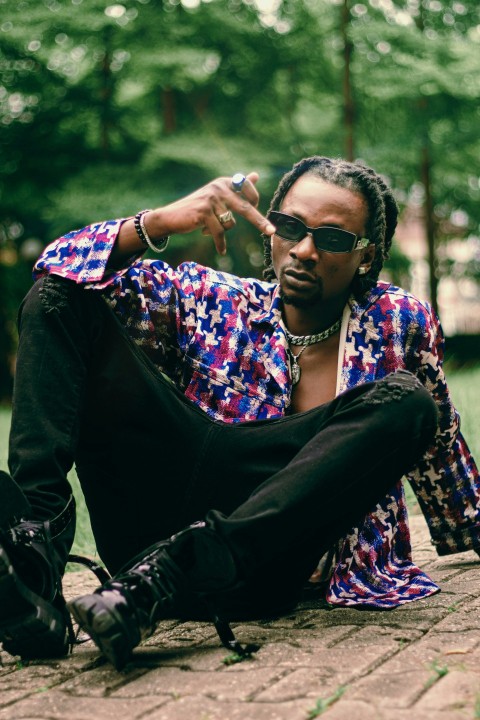 a man in a black and grey outfit with his hands out