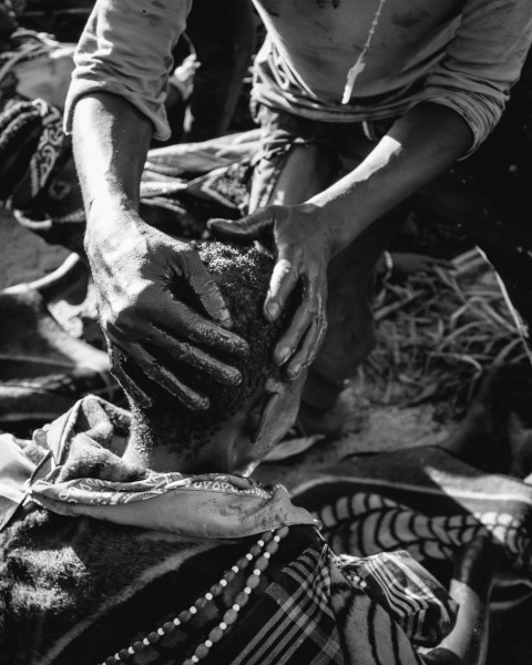 grayscale photo of person in black and white stripe shirt 91