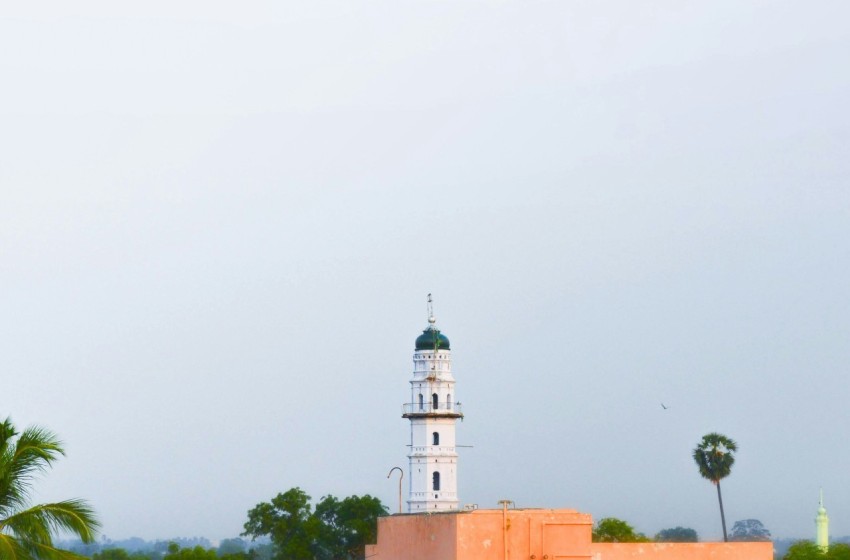 a clock tower in the middle of a field