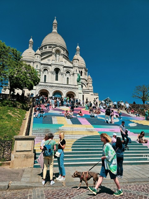 a group of people walking down a street with a dog