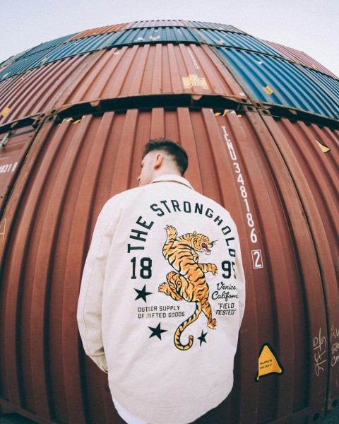 man in white and blue striped polo shirt sitting on brown wooden bench near body of during