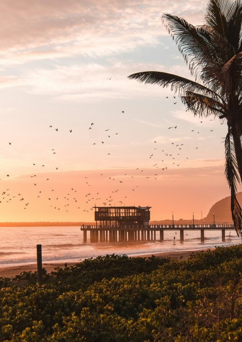 grass on shore with coconut tree and dock in distance