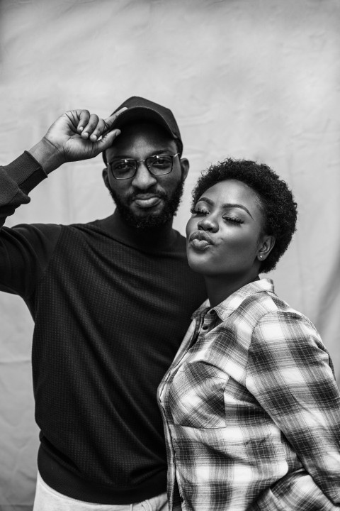 man in black crew neck t shirt and blue denim jeans sitting on white table