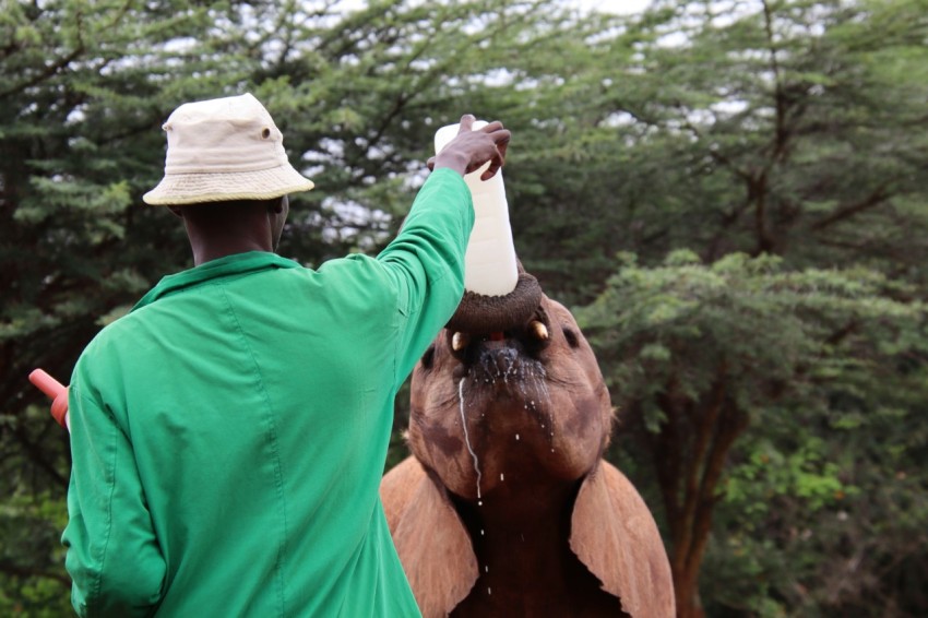 man in teal polo shirt holding brown animal statue